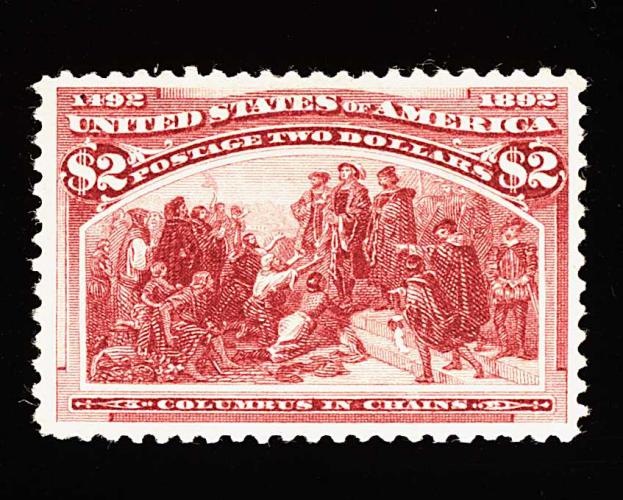 261 nh 242 image#242, $2.00 Columbian, a wonderful true "post office" fresh mint example, featuring sumptuously rich color and a razor-sharp impression, well centered within large margins, immaculate o.g. which has never been hinged, very fine and quite choice; premium never hinged examples of any of the dollar value Columbians are very rare and, in our opinion, terribly undervalued in the Scott catalog; 1999 PF certificate. (Image) 3,000.00