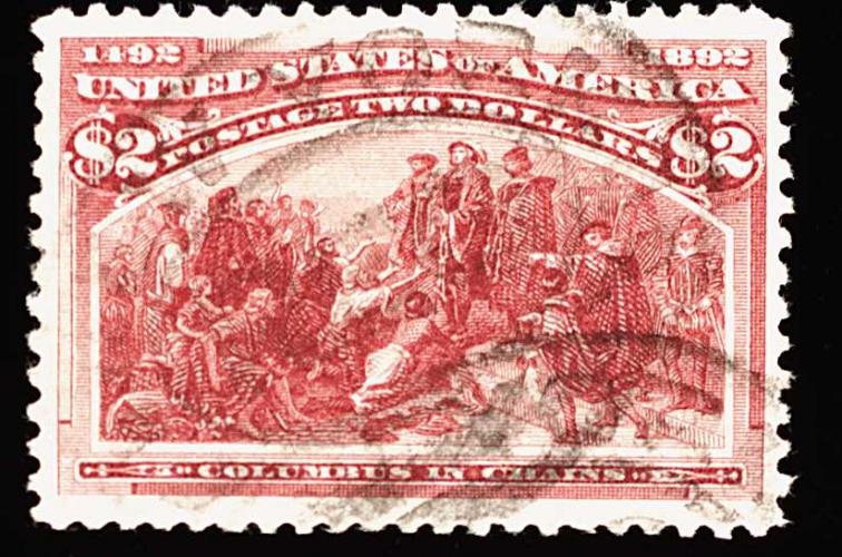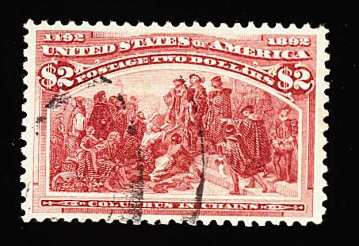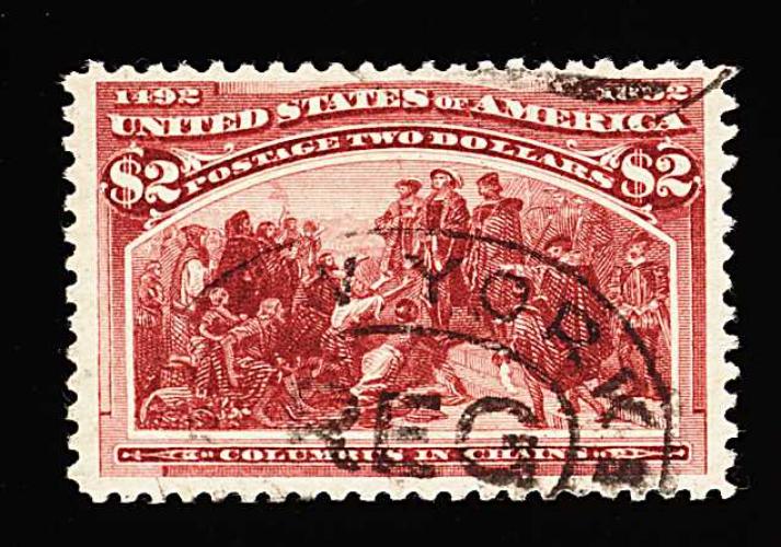 267 O 242 image#242, $2.00 Columbian, an uncommonly clean and fresh used example, rather well centered, rich luxuriant color and crisp impression, light and neat New York registry pmk., very fine and quite choice; 1986 and 1992 PF certificates. (Image) 600.00