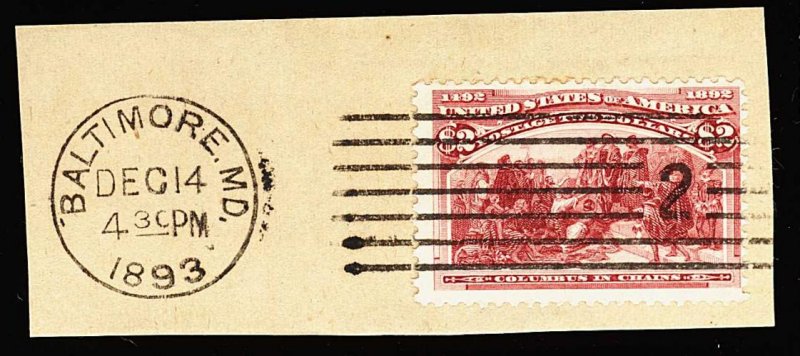 268 O 242 image#242, $2.00 Columbian, rich fresh color, tied to piece by 1893 Baltimore machine cancel, fine. (Image) 600.00