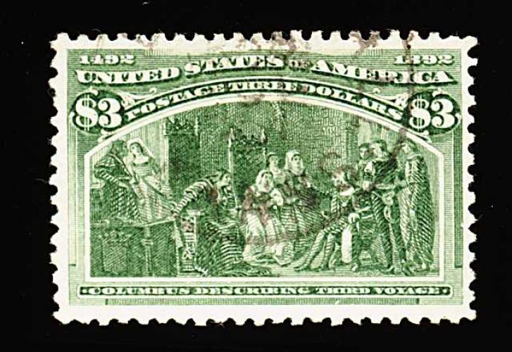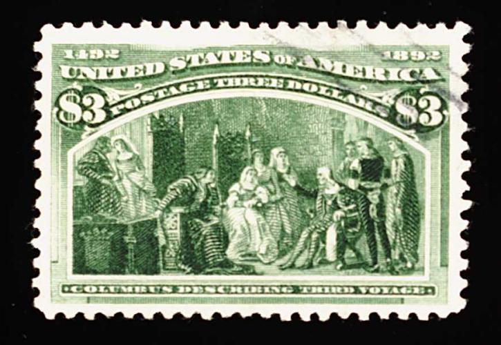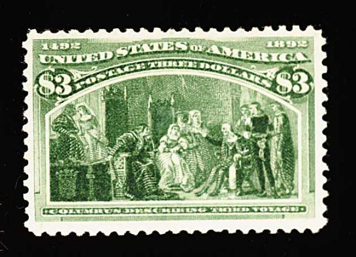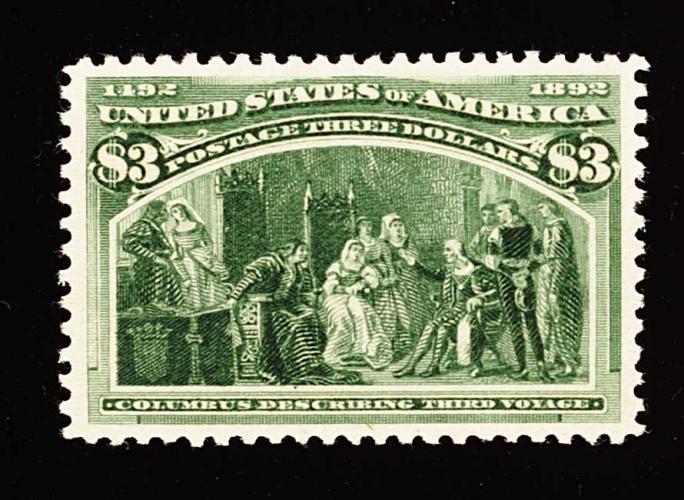 273 O 243a image#243a, $3.00 Columbian, the olive green shade, a used single that is one of the finest quality used examples we have offered in quite some time, boasting uncharacteristically large margins and being wonderfully well centered within them, deep luxuriant color and impression on fresh paper, very light cancel confined to top right corner, extremely fine; a terribly challenging stamp to find so choice used; 1990 PF certificate. (Image) 1,000.00