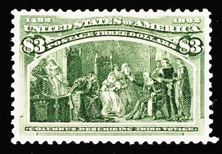 269 og 243a image#243a, $3.00 Columbian, the olive green shade, an especially desirable mint example in the preferred olive green shade, possessing flawless centering within wide precisely balanced margins, strikingly intense color and a sharp impression on bright paper, full clean o.g., lightly hinged, extremely fine; actually a rare stamp in this gem quality; 1986 PF certificate. (Image) 2,400.00
