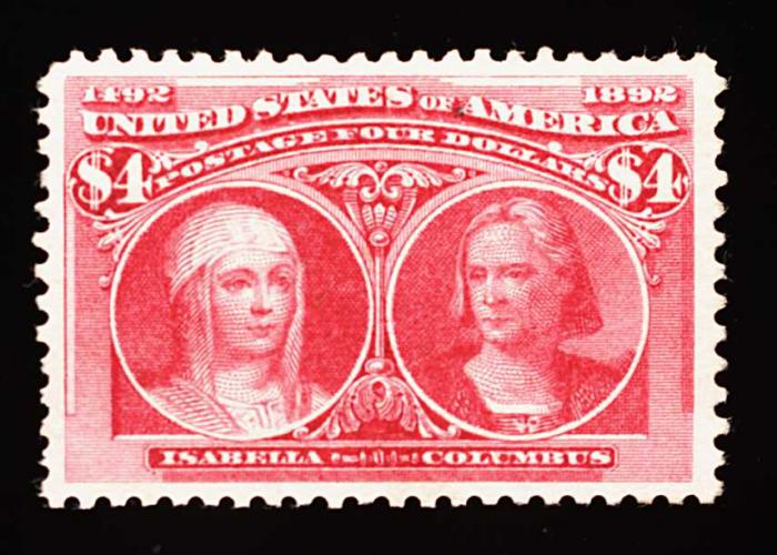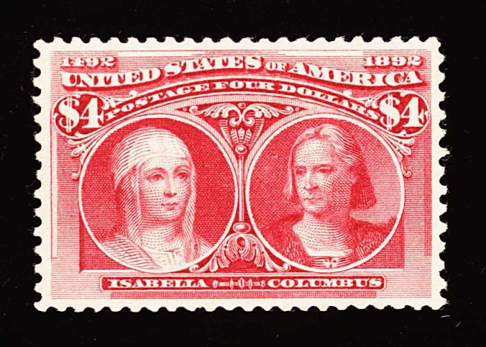 275 og 244 image#244, $4.00 Columbian, striking mint example which features extraordinarily intense crimson lake color, plus its impression is deeply etched on bright paper, wonderfully well centered amid uncharacteristically large margins, full o.g. which accompanying certificate states as being "mount disturbed", however in our opinion this is quite minor and in no way diminishes this stamp's desirability, extremely fine; 1995 PF certificate. (Image) 3,250.00