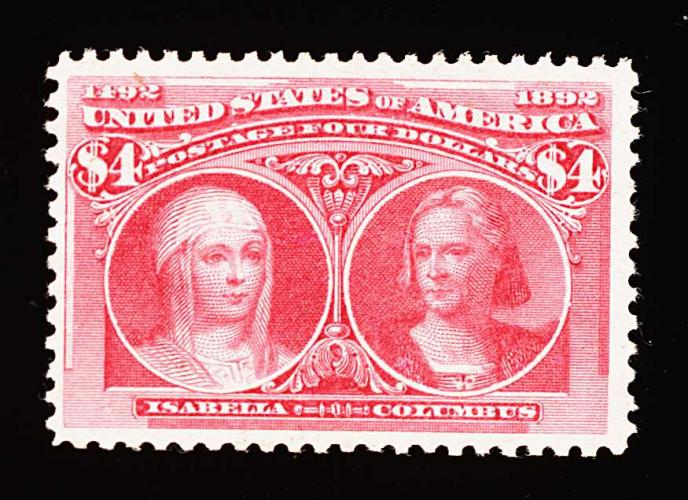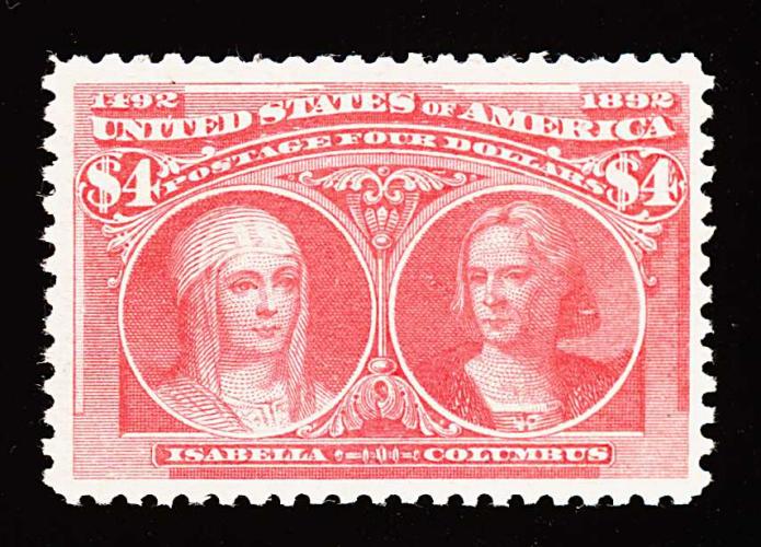 276 og 244 image#244, $4.00 Columbian, a wonderfully fresh and choice mint single, possessing gorgeous bright color and a clean impression on fresh white paper, plus it is exceedingly well centered within unusually large margins, full clean o.g., minor h.r., extremely fine; 1989 PF certificate. (Image) 3,250.00