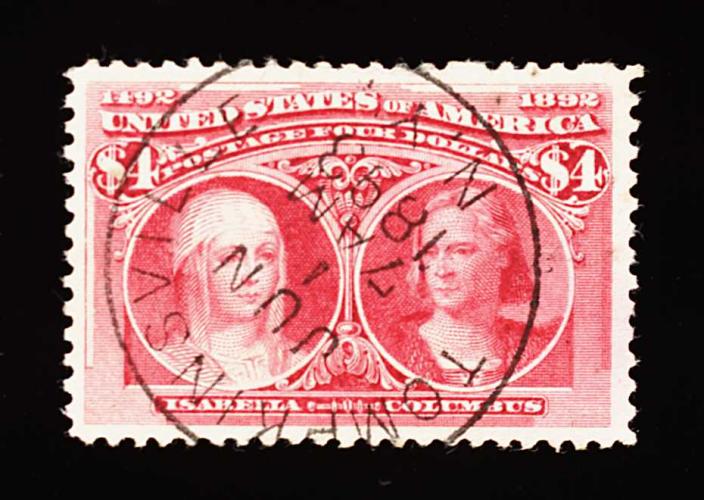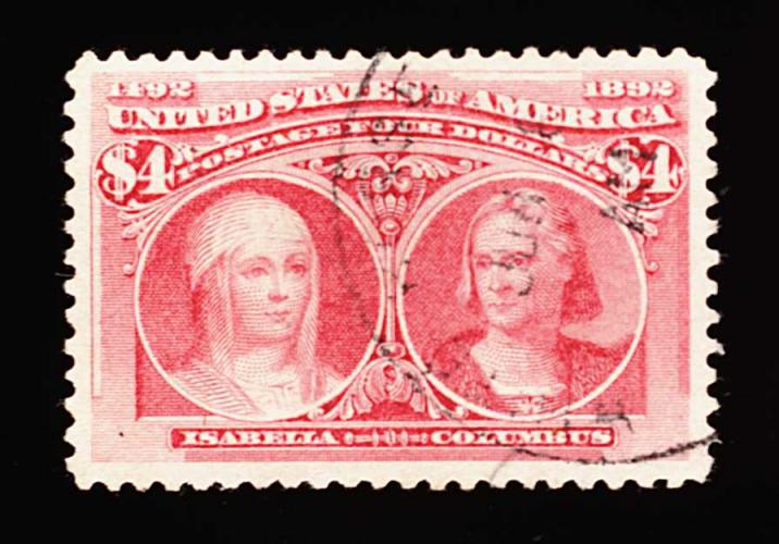 278 O 244 image#244, $4.00 Columbian, a gorgeous used example which is in a quality that is incredibly challenging to find, featuring near perfect centering amid lavishly large margins, pretty color and a very lightly struck town cancel that is not at all obtrusive, extremely fine; a stamp which combines all of the necessary desirable physical qualities (centering, size of margins and cancel) to qualify as a true gem used example; 1999 PF certificate. (Image) 1,350.00