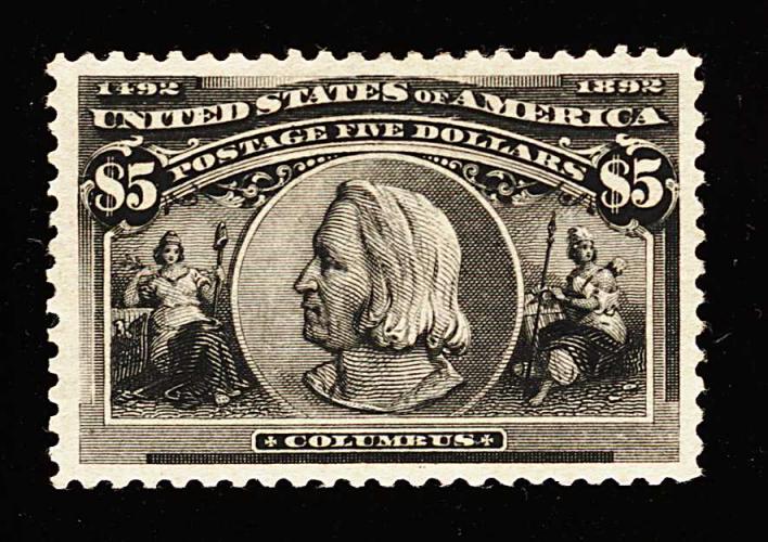 280 og 245 image#245, $5.00 Columbian, a magnificent mint example of this popular high value commemorative, in a quality that few other dollar value Columbians enjoy, as this gem possesses enormously large margins and is incredibly well centered within these impressive borders, strong color and impression, full original gum, lightly hinged, extremely fine; a stamp for the finest collection of mint U.S. stamps; 1999 PF certificate. (Image) 3,750.00
