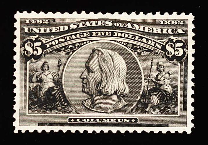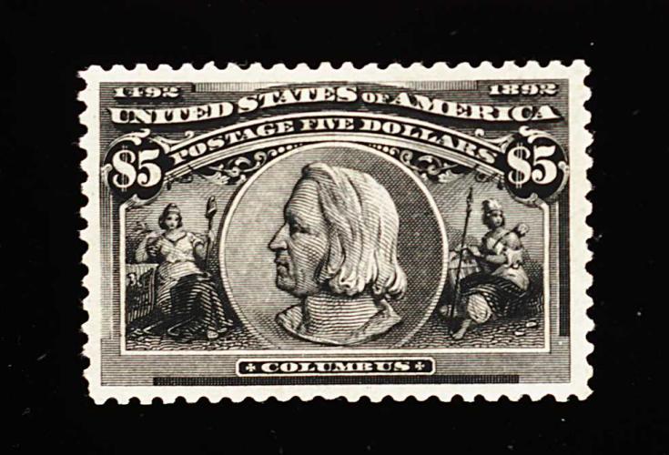 282 og 245 image#245, $5.00 Columbian, an especially handsome mint single, exceptionally well centered within extravagantly large margins, strong rich color and a sharp detailed impression on fresh paper, o.g., h.r., extremely fine; 1980 PF certificate. (Image) 3,750.00