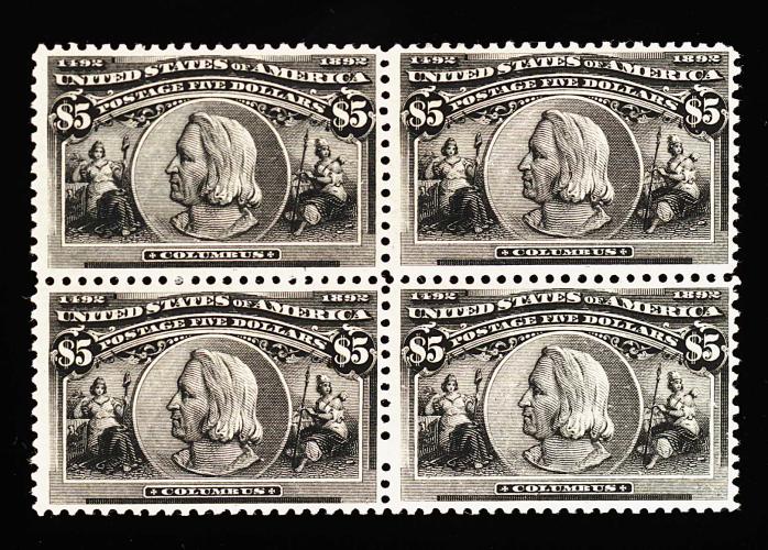 283 og/nhbl 245 image#245, $5.00 Columbian, an incredibly fresh and desirable mint block of four, possessing a wonderful overall crispness, with prooflike color and impression on bright paper, quite attractively centered, especially fresh and clean full o.g., three stamps lightly hinged, the bottom left stamp is never hinged (with a tiny natural inclusion not even mentioned on the accompanying certificate), overall a fine-very block of this popular and rare commemorative high value; 1991 PF certificate. (Image) as singles 19,250.00+