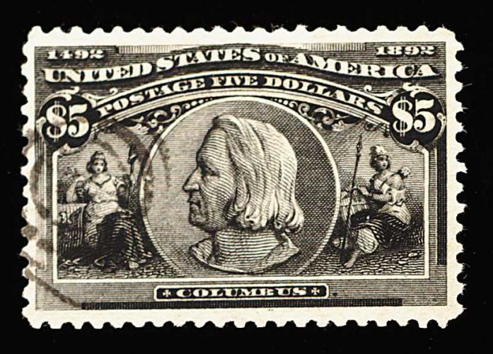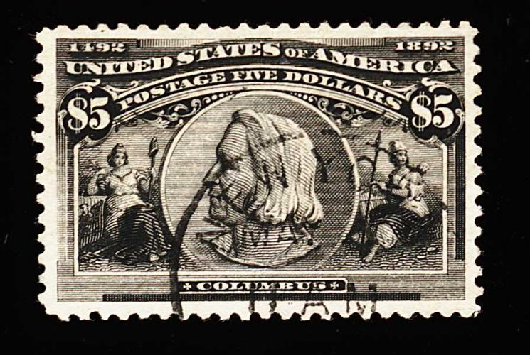 285 O 245 image#245, $5.00 Columbian, a truly remarkable used example of this high value, being among the best centered and lightly cancelled Five Dollar Columbians we have ever offered, featuring essentially perfect centering within very large margins, deep rich color and a strong impression, very light face-free target cancel confined to left, extremely fine; gem used examples such as this of the dollar value Columbians are quite challenging to find; 1999 PSE certificate. (Image) 1,600.00