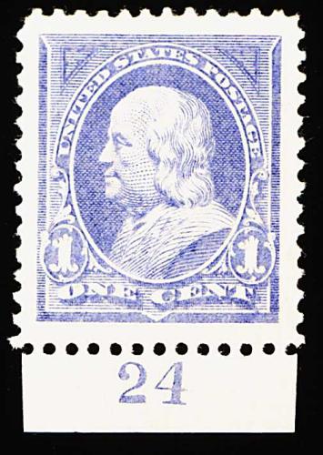 287 nh 246 image#246, 1c Ultramarine, a jumbo-margined mint bottom margin plate no. 24 single of incredible size, boasting four gigantic margins and being marvelously well centered within these enormous borders, beautiful rich color on fresh white paper, o.g., n.h., extremely fine; a "one-in-a-million" gem; 2000 PF certificate. (Image) 55.00