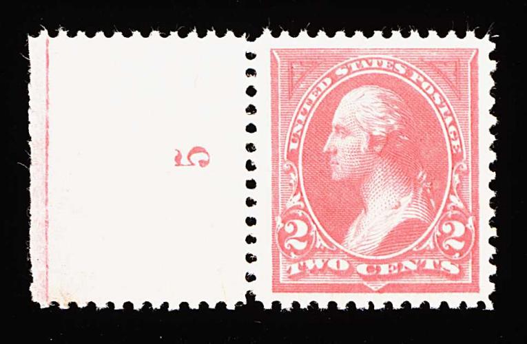 289 nh 248 image#248, 2c Pink, Ty. I, a brilliantly fresh and choice left sheet-margin plate no. 5 single, possessing rich radiant color and a crisp clean impression, plus it is exceptionally well centered within enormously large margins, o.g., n.h., an extremely fine gem; 1999 PF certificate for a strip of three, this being the top stamp. (Image) 47.50