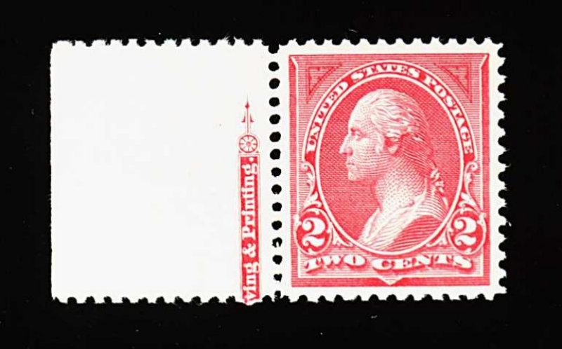 291 nh 250 image#250, 2c Carmine, Ty. I, a gem left sheet-margin partial imprint single, perfectly centered within large balanced margins, beautiful bright color and a clean impression, pristine o.g., n.h., extremely fine; 2000 PF certificate. (Image) 52.50
