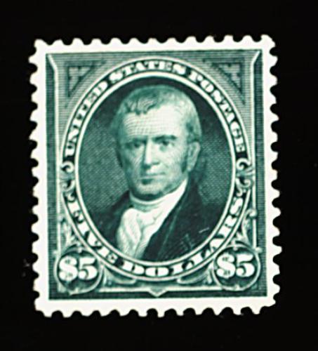 308 og 278 image#278, $5.00 Dark green, extraordinarily well centered within uncommonly large margins, rich color, o.g., faint horizontal crease at top, otherwise an extremely fine example of this scarce high value. (Image) 2,500.00