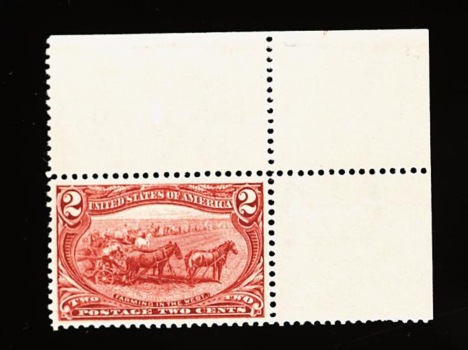 312 nh 286 image#286, 2c Trans-Mississippi, impressive top right corner sheet-margin single, featuring huge sheet selvages, stamp itself is perfectly centered amid extravagantly large margins for this value, especially deep luxuriant color, o.g., n.h., couple of trivial natural wrinkles, an extremely fine large-margined gem. (Image) 45.00