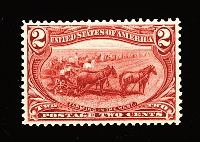 313 nh 286 image#286, 2c Trans-Mississippi, striking mint single, featuring eye-arresting color that is an intense "copper" red shade, brilliantly fresh, wonderfully well centered and margined, o.g., n.h., extremely fine; 1978 PF certificate. (Image) 45.00