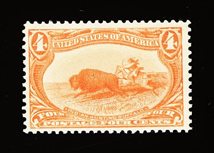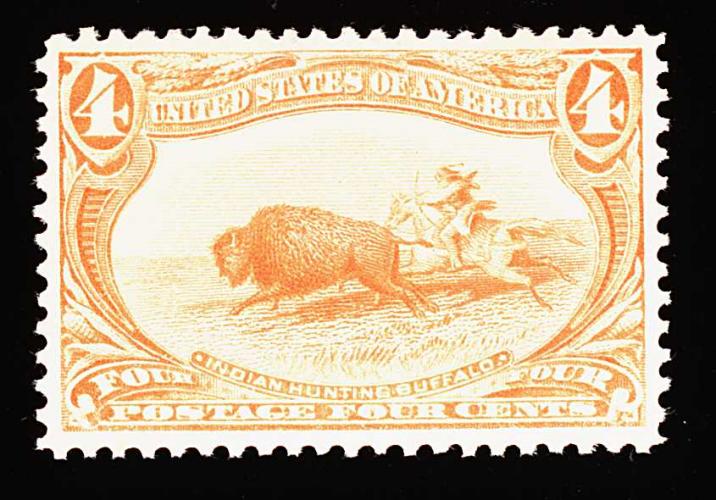 316 nh 287 image#287, 4c Trans-Mississippi, a highly select mint example, possessing considerably larger margins than typically associated with this tightly margined value, and being flawlessly centered within them, bright vivid color on immaculate paper, o.g., n.h., an extremely fine gem; 1996 PF certificate. (Image) 250.00