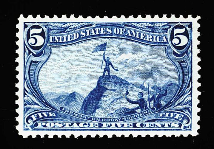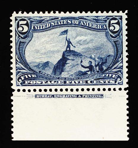 318 nh 288 image#288, 5c Trans-Mississippi, an incredibly handsome bottom margin imprint single that is not only impeccably well centered within lavishly large margins, but its color is uncommonly deep and rich, plus its impression is highly detailed, pristine o.g., n.h., an extremely fine gem in every regard; 2000 PF certificate for a pair, this being the left stamp. (Image) 230.00