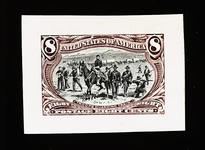 320 E 289-E4 image#289-E4, 8c Trans-Mississippi, bi-colored die essay on India, mounted on a thin card (43x32mm), small margin fault at bottom not affecting the design, very fine appearance. (Image) 375.00