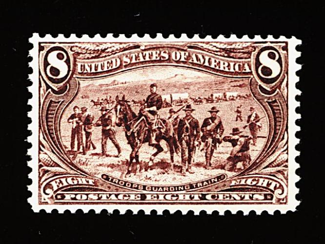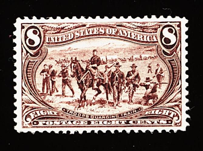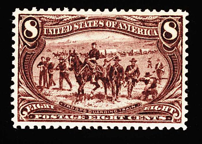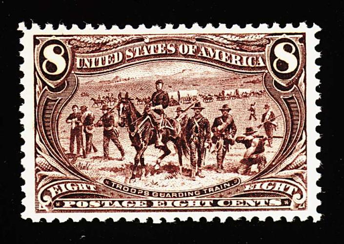 321 nh 289 image#289, 8c Trans-Mississippi, a fabulous mint example which possesses remarkable overall physical qualities which are rarely associated with this perennially difficult value, perhaps most impressive is this stamp's outstanding centering amid extravagantly large margins which are terribly uncharacteristic, and its color is about as deep and intense as we have ever seen, with a razor-sharp impression on fresh untoned paper, pristine o.g., never hinged, extremely fine; among the very finest mint Eight Cent Trans-Mississippis we have ever had the pleasure of offering in our sales; 1999 PF certificate. (Image) 310.00