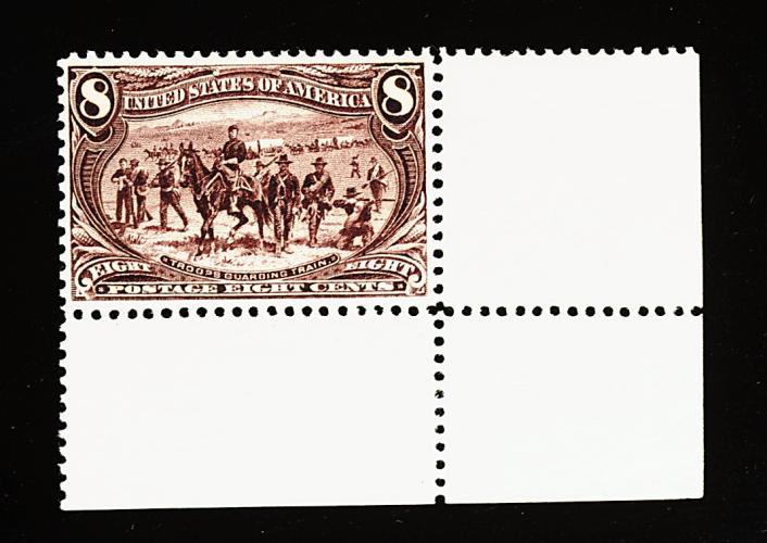 323 nh 289 image#289, 8c Trans-Mississippi, bottom right corner sheet-margin single, with extra-large selvages, very well centered within larger margins than normally associated with this value, deep rich color, o.g., n.h., fresh and extremely fine. (Image) 310.00