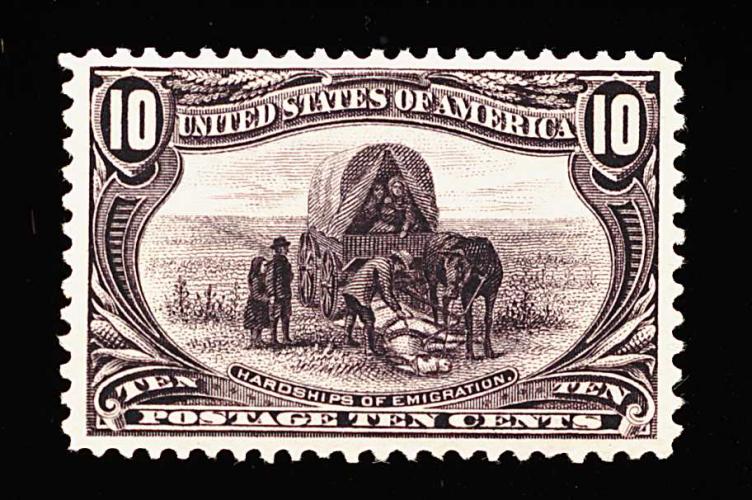 328 nh 290 image#290, 10c Trans-Mississippi, a premium quality mint example, extraordinarily well centered amid uncharacteristically large margins, especially impressive color that is an intense reddish violet shade, o.g., n.h., extremely fine; a pristine gem; 1996 PF certificate. (Image) 300.00