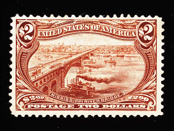 340 og 293 image#293, $2.00 Trans-Mississippi, handsome mint example of this always difficult high value commemorative, being both better centered and larger margined than typically encountered, deep luxuriant color and a sharp impression, full o.g., relatively lightly hinged, choice very fine; 1996 PF certificate. (Image) 2,100.00