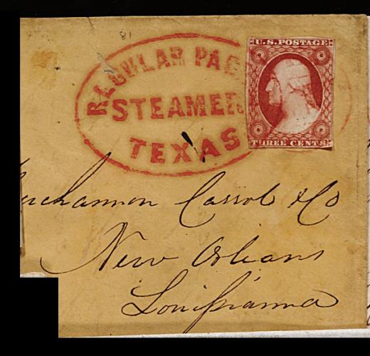 22 c imageREGULAR PACKET/STEAMER/TEXAS sharp red oval handstamp tying 3c Dull red (#11) on cover to New Orleans, stamp also tied by an additional indistinct red cancel, cover tear at top slight affects the marking, otherwise fine; this handstamp is very scarce when actually tying the stamp. (Image) Est. 150-200