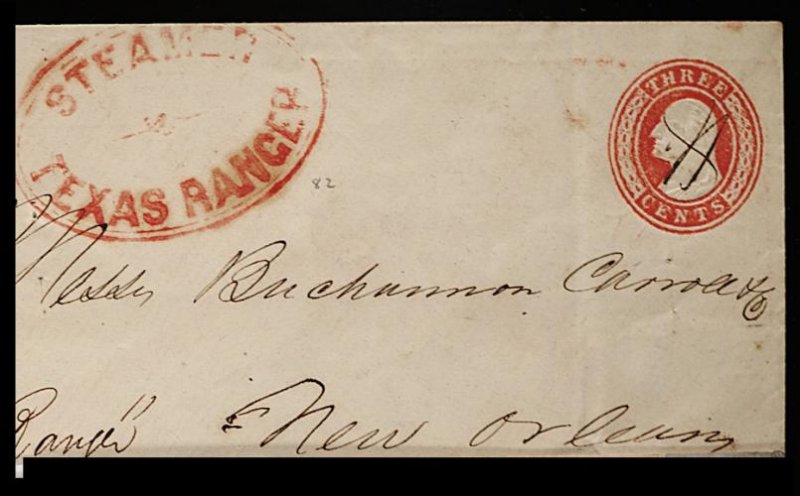 23 c imageSTEAMER/TEXAS RANGER clear red oval handstamp on 3c Entire, addressed to New Orleans, indicia ms. cancelled, vertical file fold near indicia but clear, fine and scarce. (Image) Est. 150-200