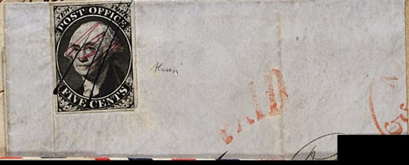 25 c 9X1 image#9X1, New York, N.Y. 5c Black Postmaster Provisional, signed ACM connected, four large margins except bottom right corner slightly rounded, strong color and impression, tied to 1846 folded letter by blue ms. cancels, with red New York c.d.s. and matching arc "Paid" alongside, sent to Hartford, Ct., very fine; 1984 Alcuri certificate. (Image) 650.00