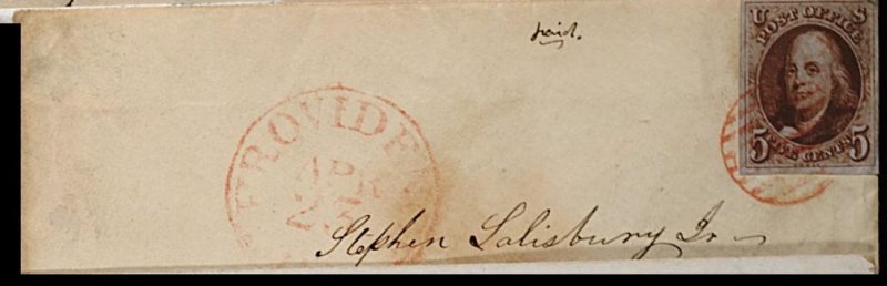 26 c 1 image#1, 5c Red brown, four large even margins, rich bright color, tied by red grid cancel with matching Providence, R.I. c.d.s. on cover to Mass., cover with a few age spots, stamp with small flaw at top right from being affixed at the edge of the cover, otherwise very fine. (Image) 700.00