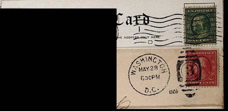 27 c 357,358 image#357, 358, 1c Green and 2c Carmine on bluish, 1c tied to a picture postcard by Washington June 18, 1909 wavy machine cancel, 2c tied to cover by Washington May 28, 1909 duplex, latter with small cover faults at top right, otherwise fine-very fine; not easy to find on cover. (Image) 310.00