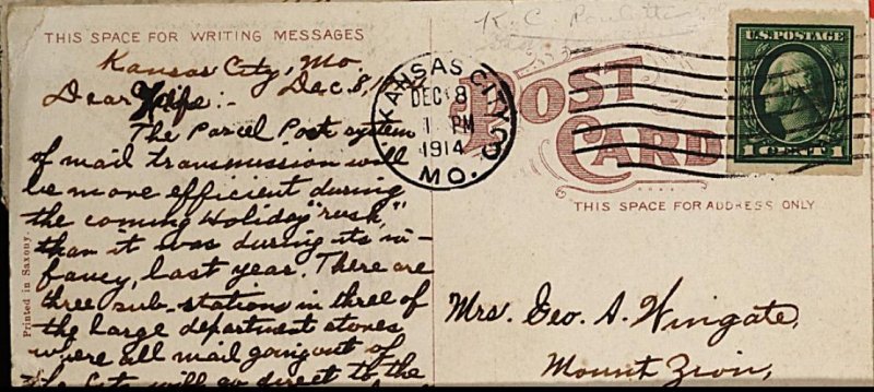 28 c 408 var. image#408 var., 1c Green with "Kansas City Roulette" perforations, tied to picture postcard by Kansas City Dec. 8, 1914 machine cancel, stamp well centered, very fine; almost impossible to find this interesting variety on cover, particularly used during the correct period, in fact, there are only four covers that have been certified by the Philatelic Foundation as being genuine usages of the Kansas City roulettes on cover. (Image) Est. 400-500