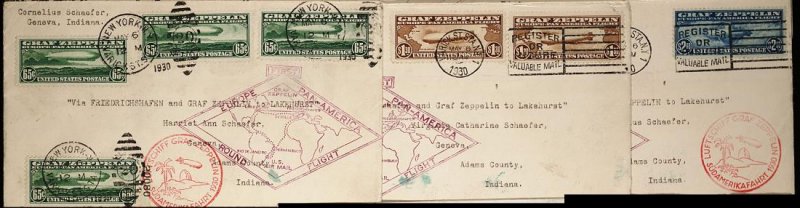 29 c C13-15 image#C13-15, 65c-$2.60 Graf Zeppelins cplt., three flown covers, one with four 65c, one with two $1.30 and one with one $2.60, each tied by May 6, 1930 Varick Station duplex to the same address in Indiana, fine-very fine; an unusual matched set of round-trip flown covers. (Image) 2,030.00+