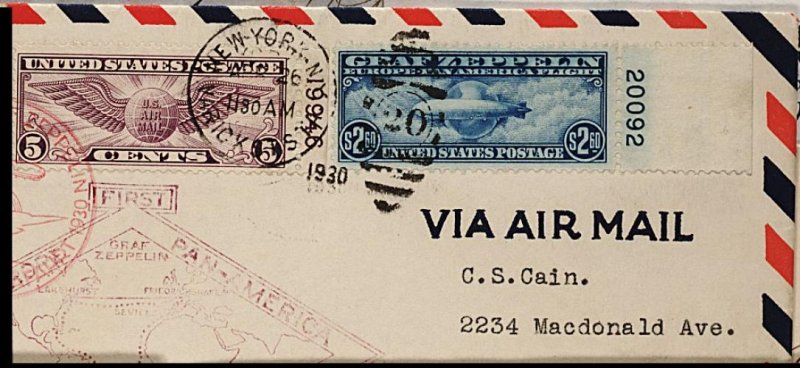30 c C15 image#C15, $2.60 Graf Zeppelin, right margin plate no. 20092 single tied by an April 26, 1930 New York duplex cancel along with a 5c Violet (#C12) to a flown round-trip cover, proper cachets and backstamps, fresh and fine-very fine. (Image) 600.00