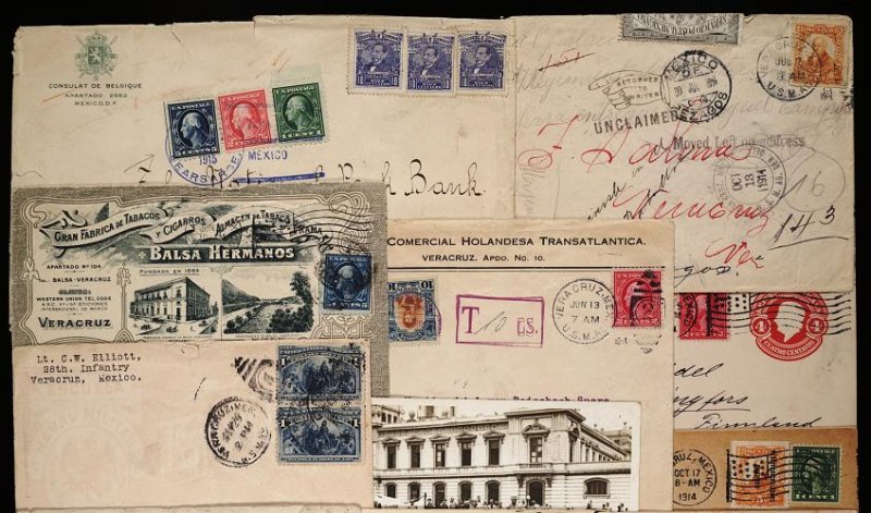 32 c U.S. Mail Agency in Vera Cruz, the remarkable collection formed by Victor Van Bourg offered intact, consisting of an amazing 97 covers from the short-lived occupation of the port, the collection begins with an 1848 stampless folded letter from Rock Dungannon, Ireland to the American Army Office in Washington from a mother inquiring about her son's military service with the U.S. Army in Vera Cruz, the other covers are from the 1913-1915 period (mostly 1914), numerous interesting and unusual items will be found, including fourteen mixed U.S. and Mexico frankings (some with Mexican postage dues), eight registered, twenty two with Mexican stamps only, several of which have interesting auxiliary markings, some attractive illustrated advertising covers, most are franked with Washington-Franklin heads, but we also note some franked with commemoratives including one with a pair of 1c Columbians, most of the destinations are to the U.S. or Mexico, but there are also covers to British Honduras (two; one illustrated advertising), Spain, Germany, England (two), Italy, two postal reply cards used to Finland (Russia), also of note is a usage on a real photo postcard of sailors at breakfast on shore, generally fine-very fine; an impressive and incredibly large assemblage which could form the nucleus of an exhibit-quality collection. (Image) Est. 3,000-4,000