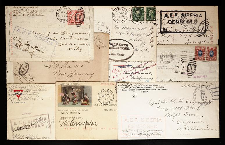 33 c Operation "Polar Bear" - The Siberian Campaign of 1918-19, an extraordinary assemblage of 77 censored covers all sent by soldiers who were part of the Allied effort to take back part of Russia from the Central Powers, concentrating on Siberia and the all-important Trans-Siberian Railway, quite likely being the largest and most comprehensive collection of these fascinating and scarce covers ever to be sold as one intact lot, about 40% of the covers are written by Americans as part of the American Expeditionary Forces (A.E.F.) whose mail was handled and censored by the British Post Office with small oval "PE/C" censor marks of the various Russian towns, there are also a few covers from soldiers as part of the British forces in Siberia, also censored in a similar fashion, the remaining concentration of covers is a remarkable range of A.E.F. mail sent to the U.S. with a wide variety of different American censor markings and all cancelled with the "U.S. Postal Agency/Siberia" duplex pmks., majority are stampless usages, but we note a few with Washington-Franklin adhesives of the period, there are several YMCA and American Red Cross corner card usages, plus we even note a few real photo postal cards and even some fascinating original enclosures; condition a bit mixed, but a great many are fine-very fine; a unique opportunity to acquire at one time what essentially could be an award-winning exhibit of these scarce and historically significant covers; offered intact from the Victor Van Bourg estate, with the exception of a few covers which have been lotted individually which follow. (Image) Est. 4,000-5,000