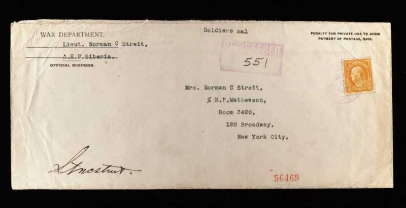 34 c 416 imageUnited States #416, 10c Orange yellow Washington-Franklin, the sole franking tied to an extraordinarily rare Operation "Polar Bear" cover by a mostly readable violet "U.S. Postal Agency, Siberia/Sep 9 1919/Registered" double ring c.d.s., with the "Siberia" portion of the postmark right on the stamp and very clear, the cover is a large registered War Department penalty corner card cover sent from "Lieut. Norman C. Streit/A.E.F. Siberia" to his wife in New York City, manuscript censor signature at bottom left, violet boxed registered handstamp, reverse with three additional partial strikes of the Siberia Agency cancel, cover and stamp with small faults of little importance, as this is the first such Washington-Franklin cover we have ever seen with this Siberian postmark; an essential cover for an award-winning exhibit collection of Washington-Franklin postal history. (Image) Est. 750-1,000