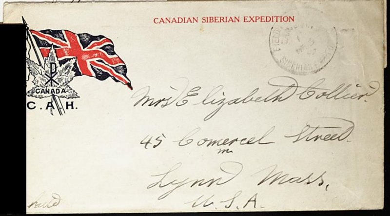 35 c imageCanadian Siberian Expedition illustrated patriotic cover used from Siberia to the United States, being a handsome red and blue design featuring the British flag and the Canadian Maple leaf, with a mostly readable "Field Post Office/Canadian/MR 9(?) 19/Siberian Exp. Force" c.d.s. at top right, unusually clean, very fine; Canadian F.P.O. covers from the "Polar Bear" operation are extremely scarce and desirable. (Image) Est. 400-500