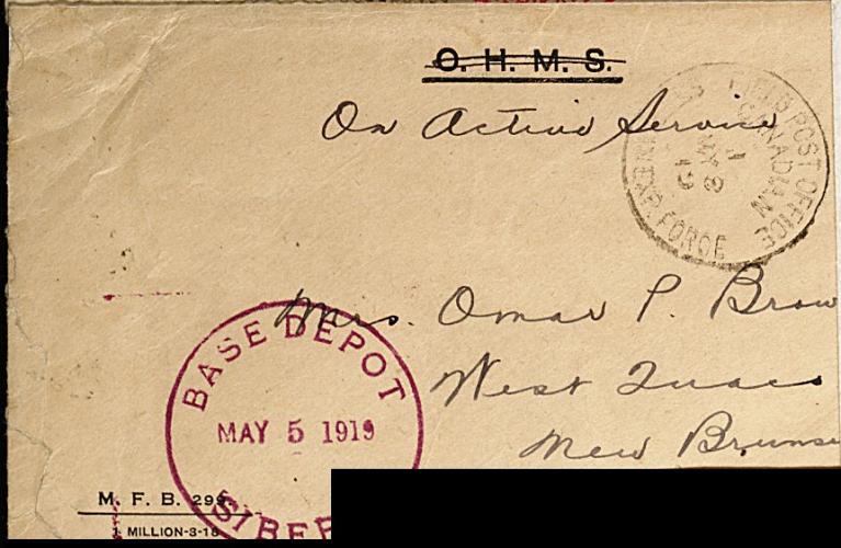36 c imageCanadian Expeditionary Forces in Siberia, an incredibly scarce group of five covers all bearing "Field Post Office/Canadian/Siberian Exp. Force" c.d.s., three are addressed to Canada, one to the U.S. and one to England, the one to England is a great censored post card illustrating "The Majestic Sight of the Allied Naval Fleet in the Port of Vladivostock", the cover to the U.S. has a "Canadian/Y.M.C.A corner card, one cover to Canada (slight repairing) bears the extremely scarce "Base Depot/May 5 1919/Siberia" violet circular handstamp (great strike); small cover faults, overall fine or better; one Canadian "Polar Bear" cover is a find, five highly interesting covers in one lot is a rare opportunity. (Image) Est. 750-1,000