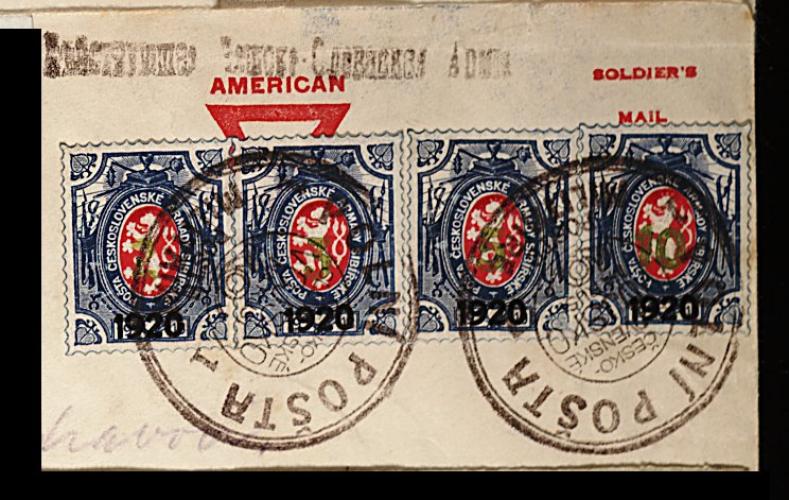 37 c imageCzechoslovakia Legion Post in Siberia, 1920 2k-10k Legion Post surcharges (Scott #6-9) tied to "American Red Cross Soldier's Mail" corner card cover, mailed out of Irkutsk to an F.P.O. in Manchuria, stamps tied by large double ring Czeck military cancels, an obvious philatelic franking, nevertheless a very rare franking, vertical file fold ending in small tear, otherwise very fine. (Image) Est. 200-300