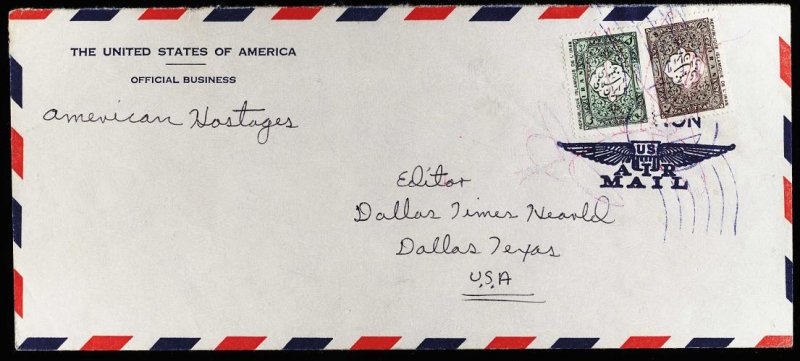 40 c image1979 Cover from an American Hostage in Iran, legal-sized official business air mail cover sent from Marine Sgt. John D. McKeel Jr., who was a hostage in Iran, on Christmas Eve, 1979 to the Dallas Times Herald, which received it January 17, 1980, Iran 5R Green and 20R Brown (#2031, 2033) tied by blue machine cancel, ms. "American Hostages" at top left in the same hand as the addresser, a few extraneous ink marks at top right affecting the stamps, fine; accompanied by a the Dallas Times Herald newspaper article with a photocopy of the letter; a most interesting cover, and one of the few pieces of modern mail which can actually be classified as a postal history rarity. (Image) Est. 750-1,000