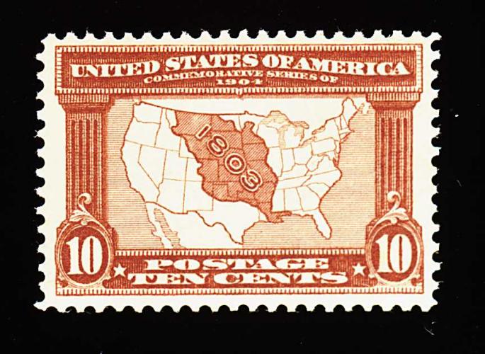 384 nh 327 image#327, 10c Louisiana Purchase, an uncommonly choice mint example of a stamp that is surprisingly elusive to find in truly premium condition, featuring uncharacteristically large and well balanced margins all around, deep luxuriant color, o.g., n.h., extremely fine; a pristine gem for the most fastidious collector; 1995 PF certificate. (Image) 325.00