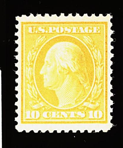 392 og 338 image#338, 10c Yellow, striking jumbo-margined mint example, possessing huge balanced margins all around, absolutely radiant color, o.g. which is slightly mount disturbed (although accompanying certificate simply states "never hinged"), extremely fine; cataloged as a hinged stamp. (Image) 67.50
