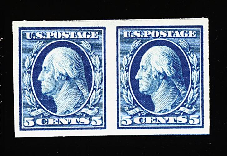 399 nh 343-47 image#343-47, 1908-09 1c-5c Imperforates cplt., select well matched set of horizontal pairs, each wonderfully fresh and particularly well margined, o.g., n.h., extremely fine. (Image) as n.h. singles 275.00+