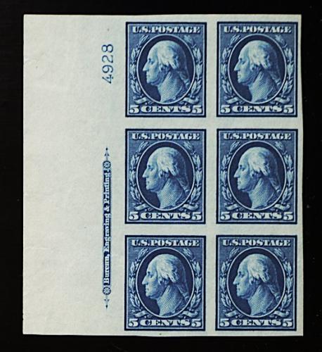 400 ogX 343-47 image#343-47, 1c-5c Imperforates cplt., a set of left margin imprint and plate number blocks of six, each with large sheet selvage, strong color, o.g., 3c and 4c hinged, others n.h., 2c with small tear in the far selvage (could be trimmed), very fine. (Image) 1,052.50