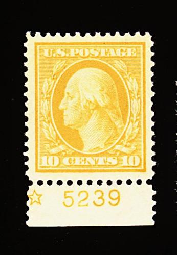 444 nh 381 image#381, 10c Yellow, a particularly handsome bottom margin plate no. 5239 single, featuring excellent centering within lavishly large margins, gorgeous intense color, o.g., n.h., extremely fine; 2000 PF certificate. (Image) 165.00