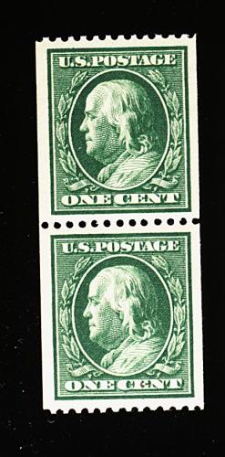 447 nh 385 image#385, 1c Green coil, perf. 12 horiz., pair, extraordinarily well centered amid impressively large margins on both stamps, sumptuously rich color, immaculate o.g., n.h., extremely fine; while #385 pairs are relatively available, few are found in this true gem condition; 1999 PF certificate. (Image) 125.00