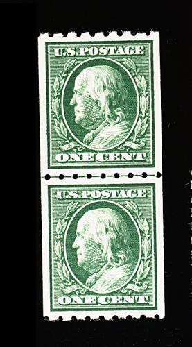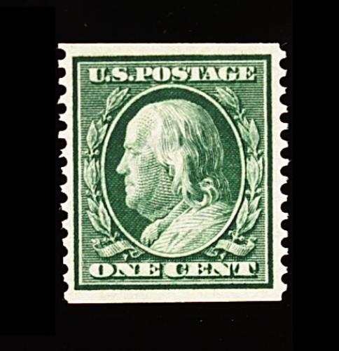 448 nh 387 image#387, 1c Green coil, perf. 12 vert., a gem mint single of a coil that is next to impossible to find in premium quality (not to mention genuine), flawlessly centered within well balanced margins, wonderfully fresh and crisp, deep rich color, pristine o.g., n.h., extremely fine; 1997 PSE certificate. (Image) 210.00