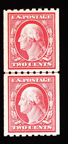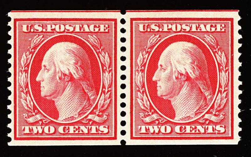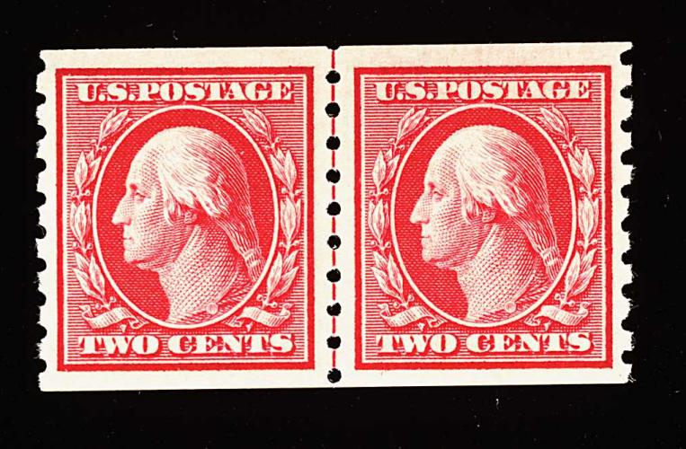 456 nh 393 image#393, 2c Carmine coil, perf. 8 1/2 vert., a magnificent guide line pair, being in a condition unlike any other we have offered in many years, possessing mathematically precise centering amid lavishly large margins, even its guide line is perfectly centered between the two stamps, absolutely radiant color and impression on bright paper, immaculate o.g., without a single gum bend or skip, o.g., n.h., extremely fine; to find a guide line pair in this gem quality is a terribly frustrating and difficult task; certain to realize impressive multiples of its catalog value; 1995 PF certificate. (Image) 425.00