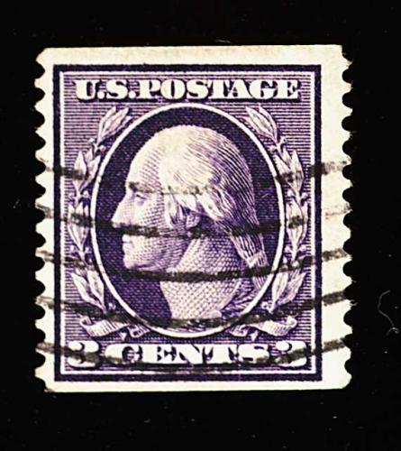 451 O 389 image#389, 3c Deep violet, Ty. I, "Orangeburg Coil", perf. 12 vert., a marvelous used example of this rare and sought after coil, which was issued specifically for use by the Bell Pharmaceutical Co. to mail their samples to doctors, the centering is remarkably nice, being considerably better than most of the small population that exists, additionally its color is the characteristic deep violet shade, neat and unobtrusive wavy line machine postmark, there are single mild corner creases in each top corner (which are quite endemic to these), neither of which affect this stamp's exceptional very fine appearance; a highly desirable example of this major 20th century coil rarity; 1959 APS and 1980 PF certificates; ex-Lyons. (Image) 10,000.00