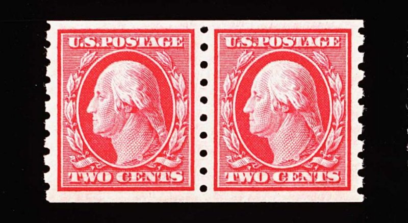 455 nh 393 image#393, 2c Carmine coil, perf. 8 1/2 vert., a magnificent quality mint pair, being in a quality which is almost impossible to duplicate, as this remarkable pair is absolutely perfectly centered amid lavishly large margins, dazzling color and a prooflike impression add further to this pair's tremendous eye appeal, even and intact perforations (most unusual on the perf. 8 1/2 coils), unblemished o.g., without a single gum bend or skip, n.h., a superb pair for the finest collection; 1999 PF certificate. (Image) 180.00